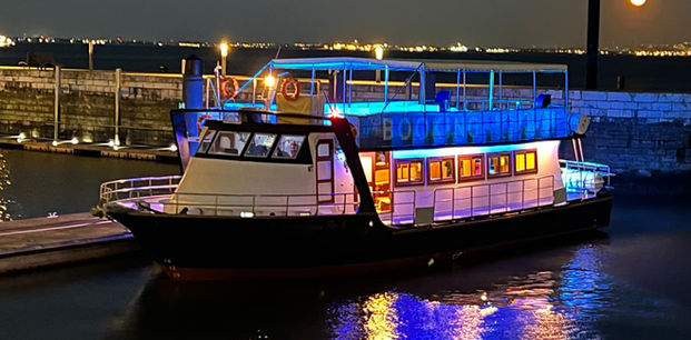 Este barco a motor, espaçoso e versátil consegue albergar todo o tipo de eventos durante todo o ano.